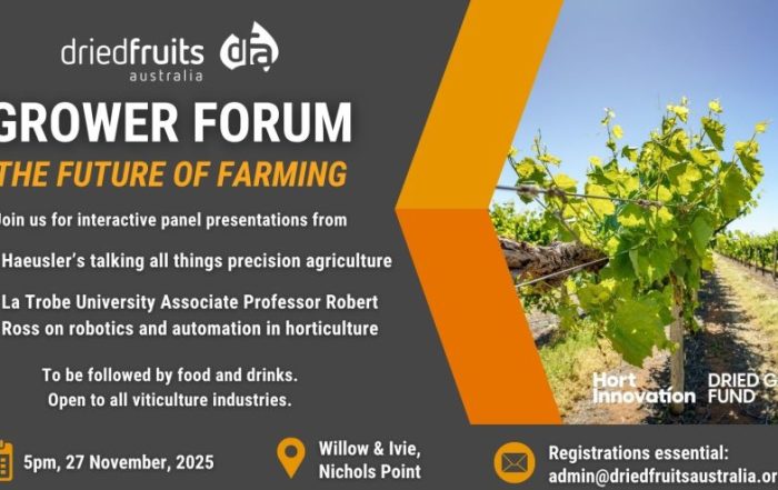 Dried Fruits Australia will host its 2025 Grower Forum – The future of farming on 27 November. When: 5pm, Thursday 27 November Where: Willow & Ivie, Nichols Point Join us for interactive panel presentations [...]